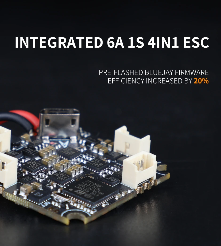 - Bluejay ESC Firmware: Pre-flashed with Bluejay for smoother motor control and support for 48kHz/96kHz PWM frequency (longer flight times).