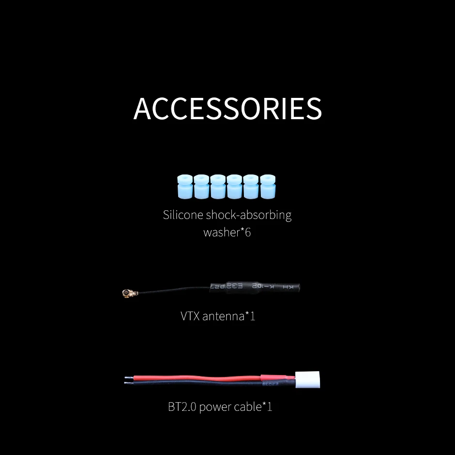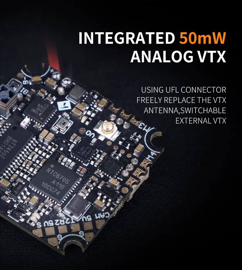 - Integrated VTX: Features an onboard 50mW analog video transmitter with SmartAudio support.