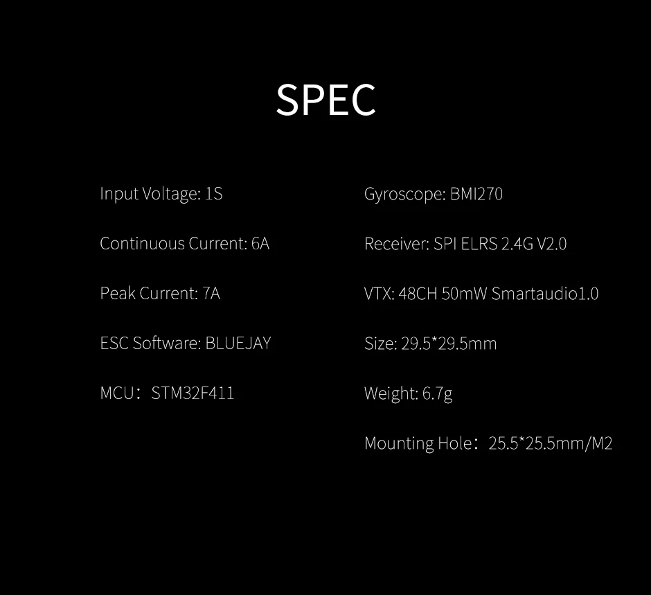 - Mounting: 25.5 x 25.5mm (Whoop Pattern)